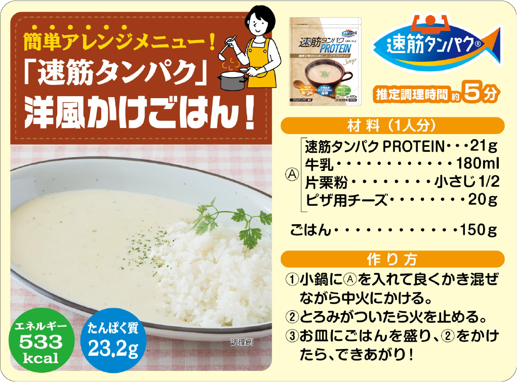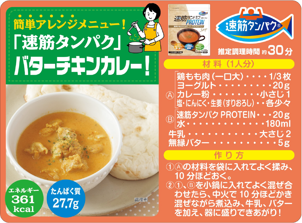 ・栄養成分表示 (専用スプーン2杯 (21g) あたり) : エネルギー 88kcal / たんぱく質 9.0g / 脂質 2.8g / 炭水化物 6.8g / 食塩相当量 1.3g